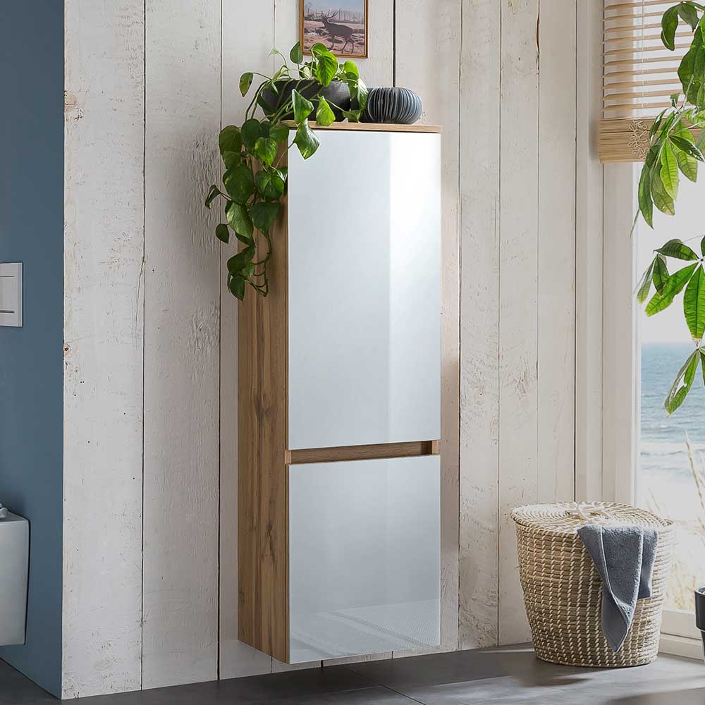 Mit unserem Hochschrank in Weiß und Wildeiche Optik mit Glasbeschichtung können Sie Ihr Badezimmer ganz nach Ihren Wünschen gestalten. Kombinieren Sie den Schrank mit anderen Möbeln aus unserer Serie und schaffen Sie ein harmonisches Gesamtbild. Ihrer Fantasie sind keine Grenzen gesetzt.
