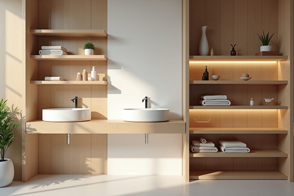 | Design | Schwebende Regale | Modern, minimalistisch, schafft optische Weite, leichte Reinigung des Bodens | Erfordert stabile Wandmontage, oft geringere Tragfähigkeit als feste Regale | Moderne Badezimmer, kleine Räume, Fokus auf Ästhetik |
