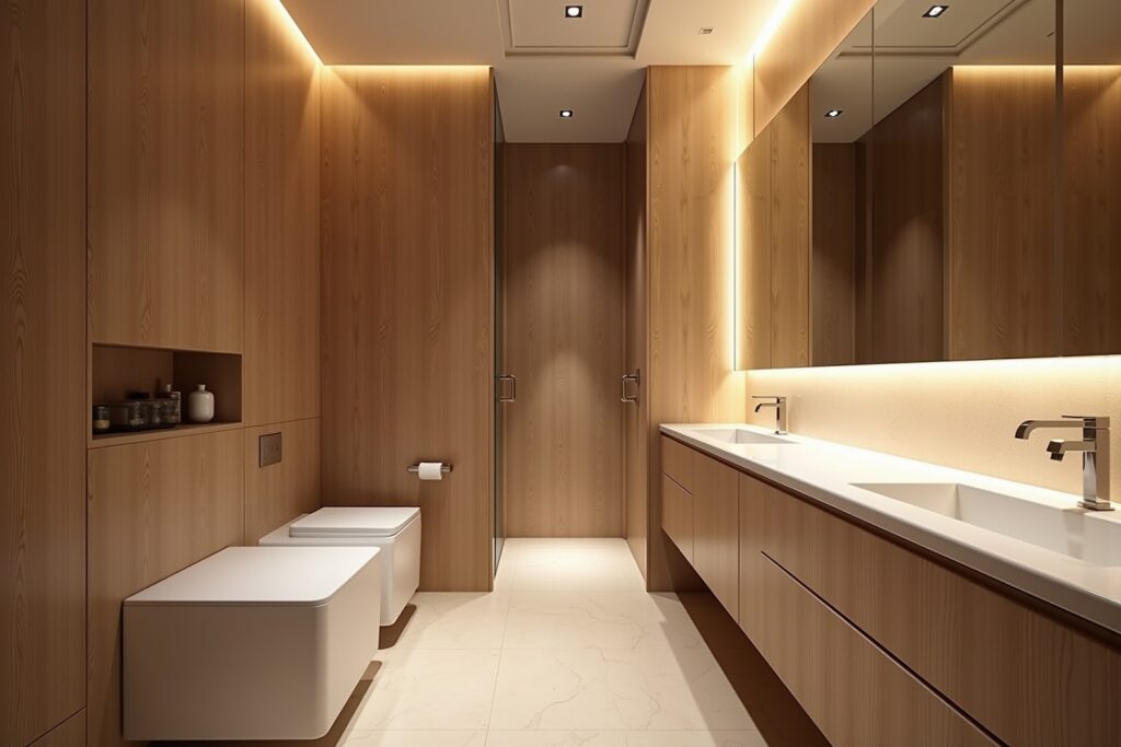 - Möbel und Einbauten: Holzpaneele können auch für die Verkleidung von Waschtischunterschränken oder anderen Einbauten genutzt werden, um ein durchgängiges Design zu schaffen.