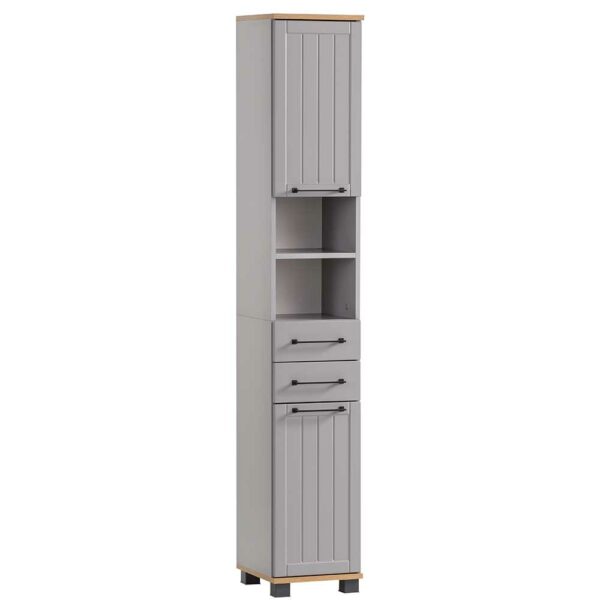 Die Kombination aus Platingrau und Eichefarben verleiht dem Schrank eine warme und einladende Ausstrahlung. Die feinen Details und die sorgfältig ausgewählten Materialien zeugen von der hohen Qualität dieses Möbelstücks. Mit diesem Badhochschrank verwandeln Sie Ihr Badezimmer in eine Wohlfühloase, in der Sie sich rundum entspannen können.