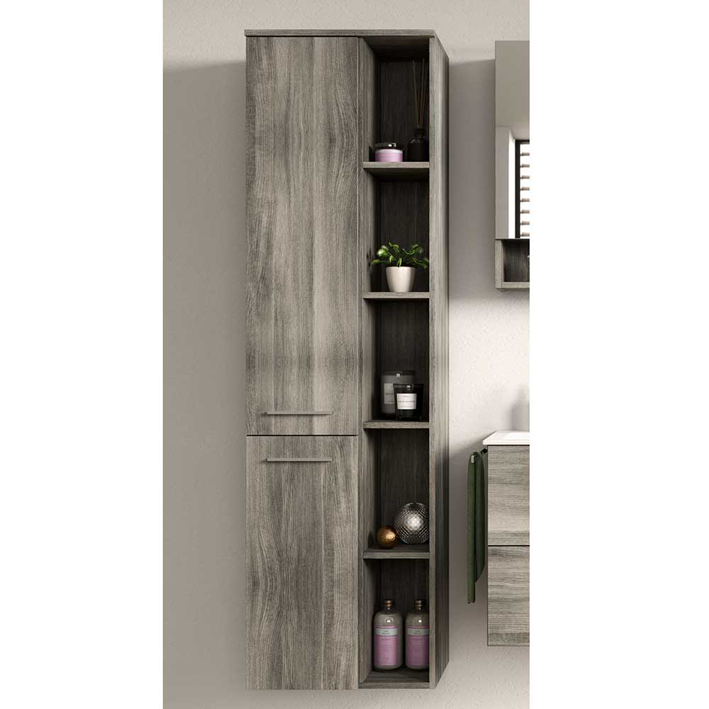 Entdecken Sie mit unserem hängenden Midischrank eine neue Dimension der Badgestaltung. Dieses exquisite Möbelstück vereint funktionales Design mit einer ästhetischen Holzoptik in edlem Rauchgrau und verwandelt Ihr Badezimmer in einen Ort der Entspannung und des Wohlbefindens. Mit einer Höhe von 174 cm bietet dieser Schrank reichlich Stauraum, ohne dabei wertvolle Bodenfläche zu beanspruchen – ideal für kleine und große Bäder.