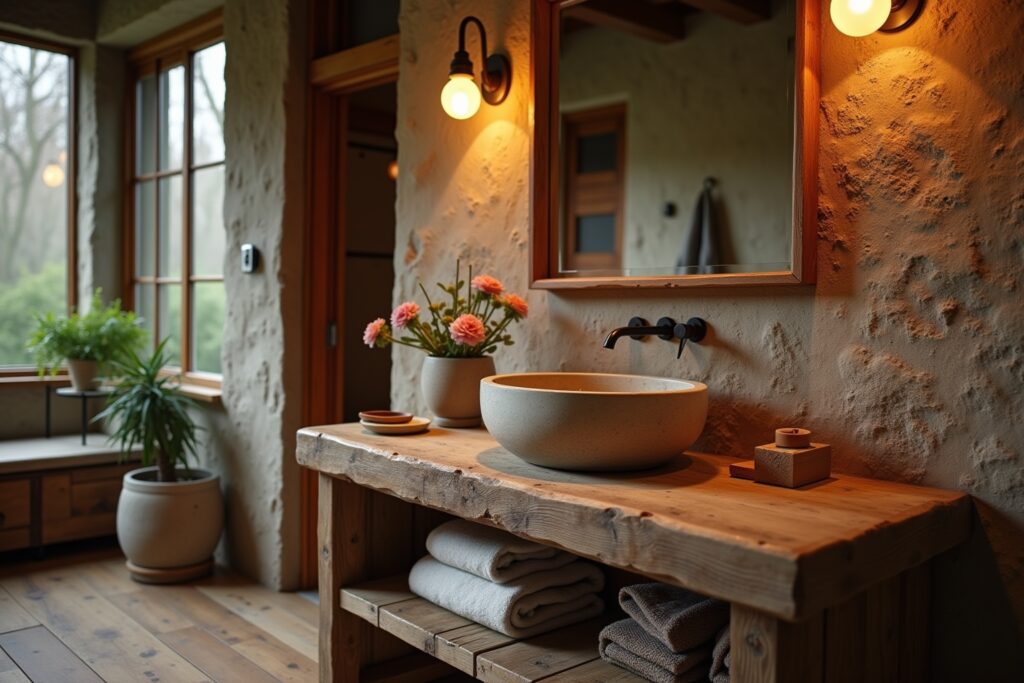 - Natürliche Materialien im Umfeld: Kombiniere den Waschtisch mit weiteren natürlichen Materialien wie Holzaccessoires, Steinböden oder textilen Elementen aus Leinen oder Baumwolle.